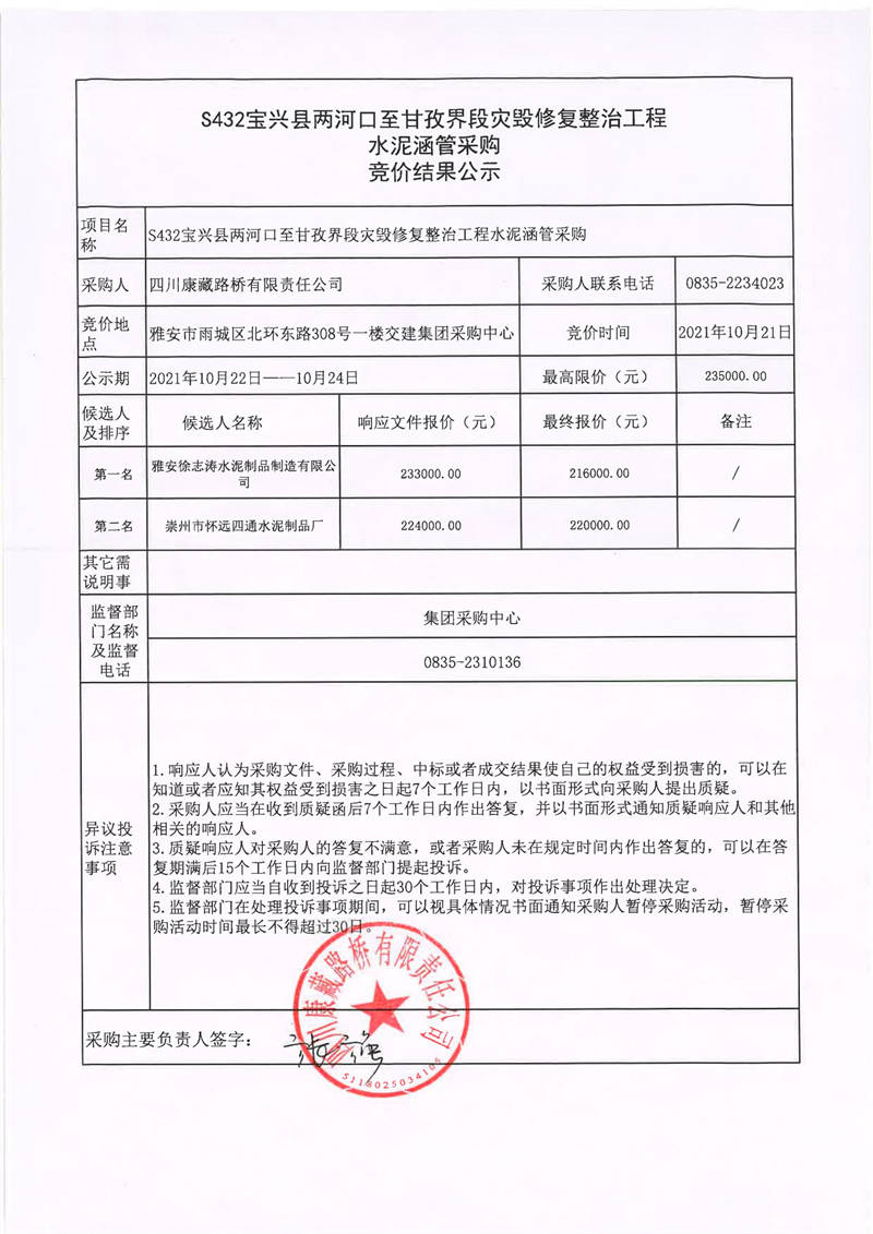 四川康藏路橋有限責(zé)任公司S432線寶興縣兩河口至甘孜界段災(zāi)毀修復(fù)整治工程水泥涵管采購競價(jià)結(jié)果公示