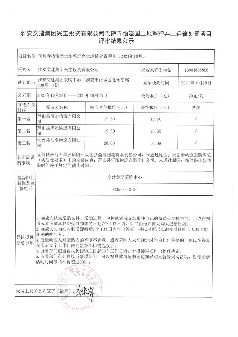 雅安交建集團(tuán)興寶投資有限公司代碑寺物流園土地整理棄土運輸處置項目評審結(jié)果公示