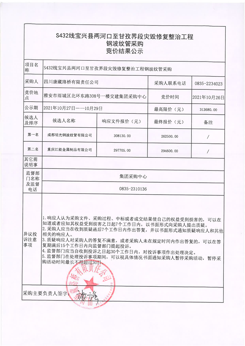 四川康藏路橋有限責任公司S432線寶興縣兩河口至甘孜界段災(zāi)毀修復整治工程鋼波紋管采購競價結(jié)果公示