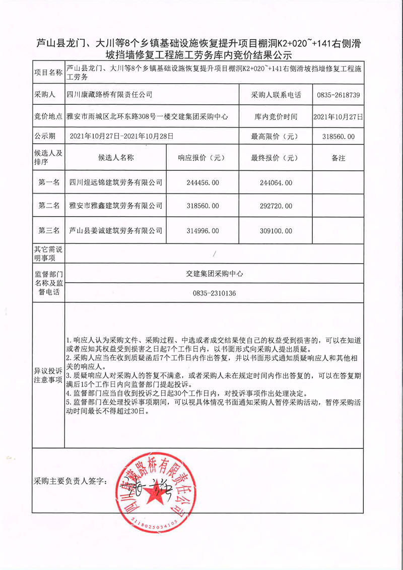 四川康藏路橋有限責(zé)任公司蘆山縣龍門、大川等8個(gè)鄉(xiāng)鎮(zhèn)基礎(chǔ)設(shè)施恢復(fù)提升項(xiàng)目棚洞K2+020~+141右側(cè)滑坡?lián)鯄π迯?fù)工程施工勞務(wù)庫(kù)內(nèi)競(jìng)價(jià)結(jié)果公示