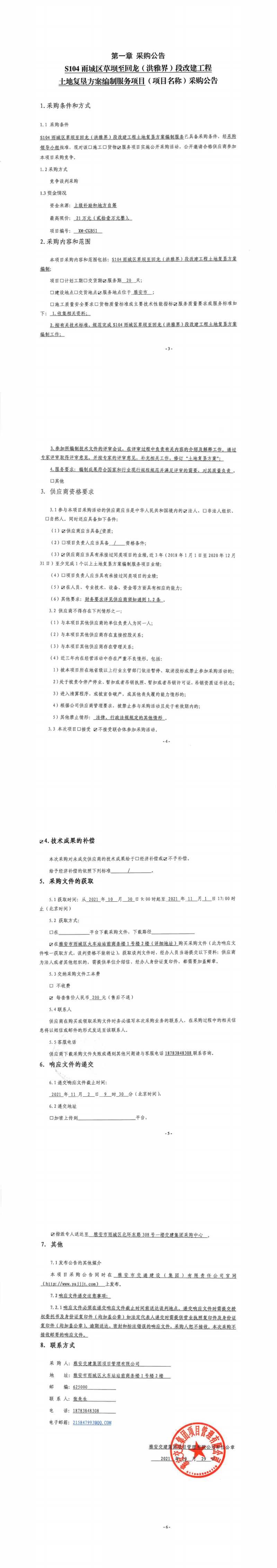 雅安交建集團項目管理有限公司S104雨城區(qū)草壩至回龍(洪雅界)段改建工程土地復墾方案編制服務(wù)項目采購公告