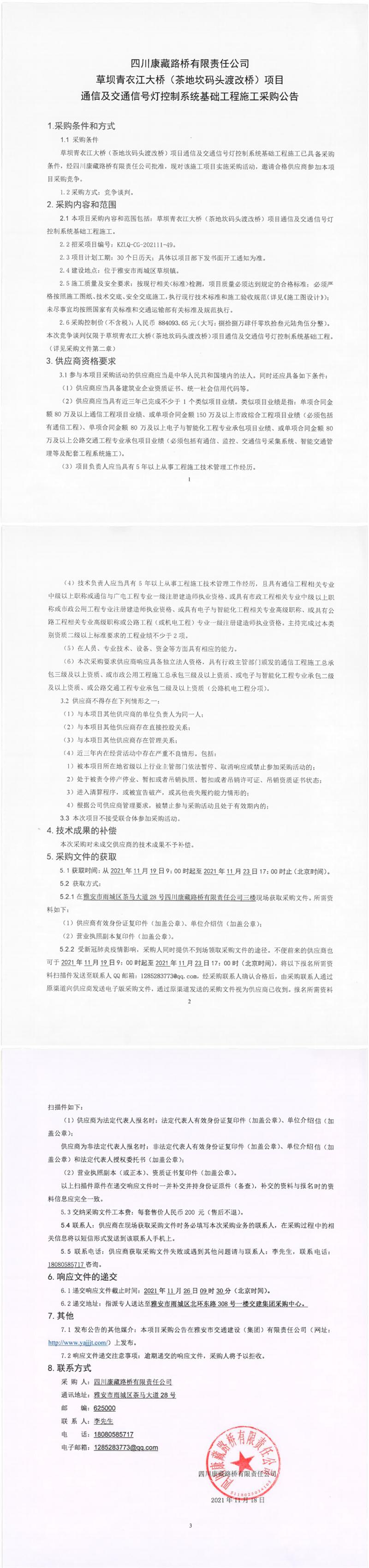 四川康藏路橋有限責(zé)任公司草壩青衣江大橋(茶地坎碼頭渡改橋)項目通信及交通信號燈控制系統(tǒng)基礎(chǔ)工程施工采購公告
