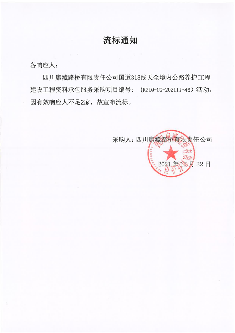 四川康藏路橋有限責(zé)任公司國(guó)道318線天全境內(nèi)公路養(yǎng)護(hù)工程建設(shè)工程資料承包服務(wù)采購(gòu)流標(biāo)通知