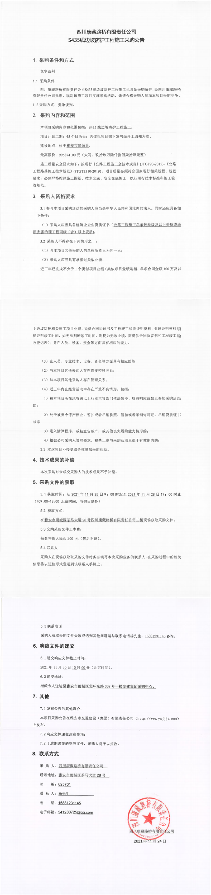 四川康藏路橋有限責(zé)任公司S435線邊坡防護(hù)工程施工采購(gòu)公告
