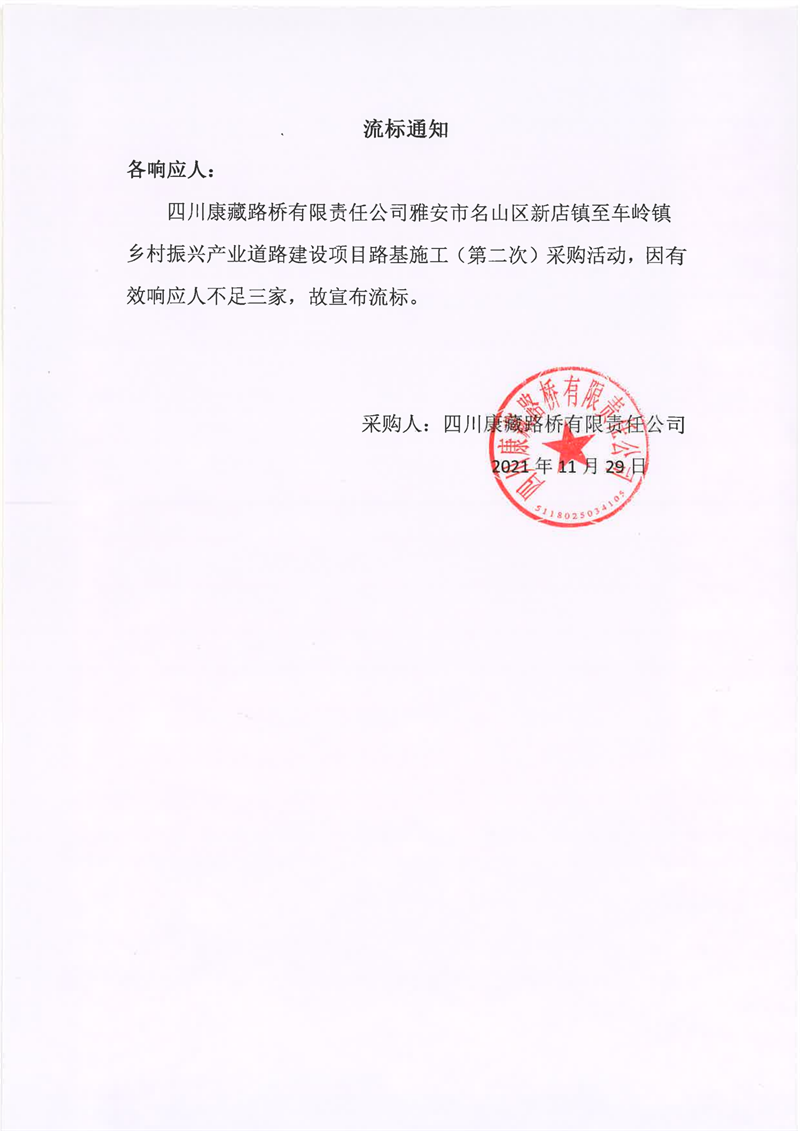 四川康藏路橋有限責(zé)任公司雅安市名山區(qū)新店鎮(zhèn)至車嶺鎮(zhèn)鄉(xiāng)村振興產(chǎn)業(yè)道路建設(shè)項(xiàng)目路面施工(第二次)流標(biāo)通知
