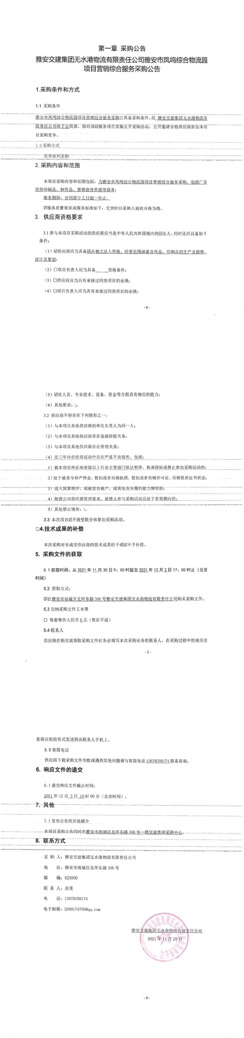 雅安交建集團(tuán)無(wú)水港物流有限責(zé)任公司雅安市鳳鳴綜合物流園項(xiàng)目營(yíng)銷綜合服務(wù)采購(gòu)公告