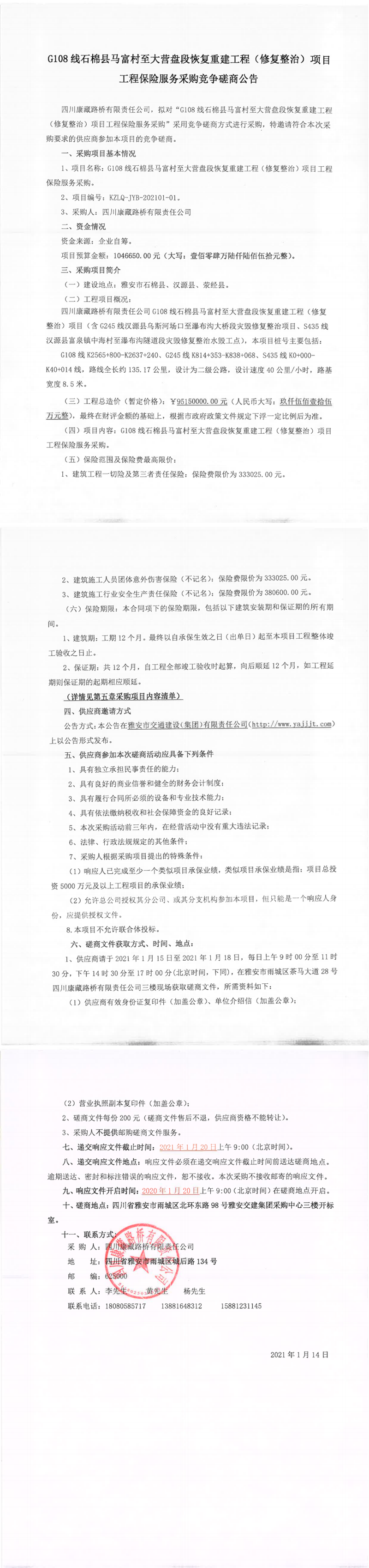 四川康藏路橋有限公司G108線(xiàn)石棉縣馬富村至大營(yíng)盤(pán)段恢復(fù)重建工程(修復(fù)整治)項(xiàng)目工程保險(xiǎn)服務(wù)采購(gòu)競(jìng)爭(zhēng)磋商公告