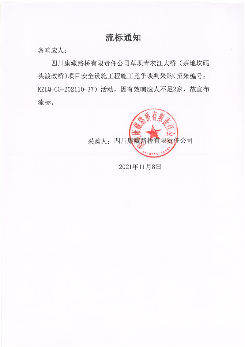 四川康藏路橋有限責(zé)任公司草壩青衣江大橋(茶地坎碼頭渡改橋)項目安全設(shè)施工程施工流標通知