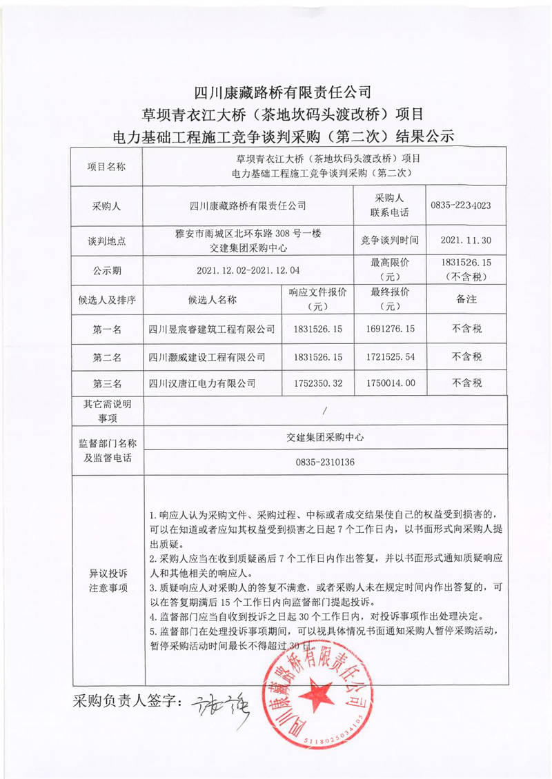 四川康藏路橋有限責任公司草壩青衣江大橋(茶地坎碼頭渡改橋)項目電力基礎(chǔ)工程施工競爭談判采購(第二次)結(jié)果公示