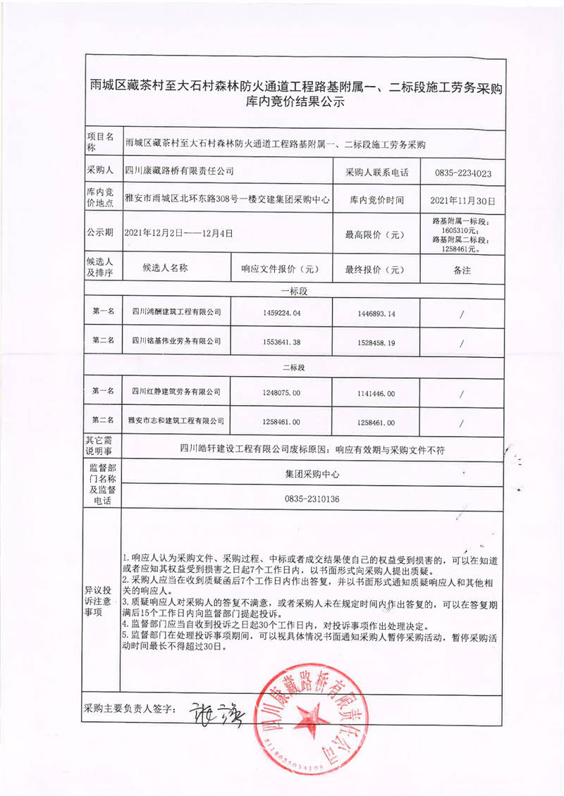 四川康藏路橋有限責(zé)任公司雨城區(qū)藏茶村至大石村森林防火通道工程路基附屬一、二標段施工勞務(wù)采購庫內(nèi)競價結(jié)果公示