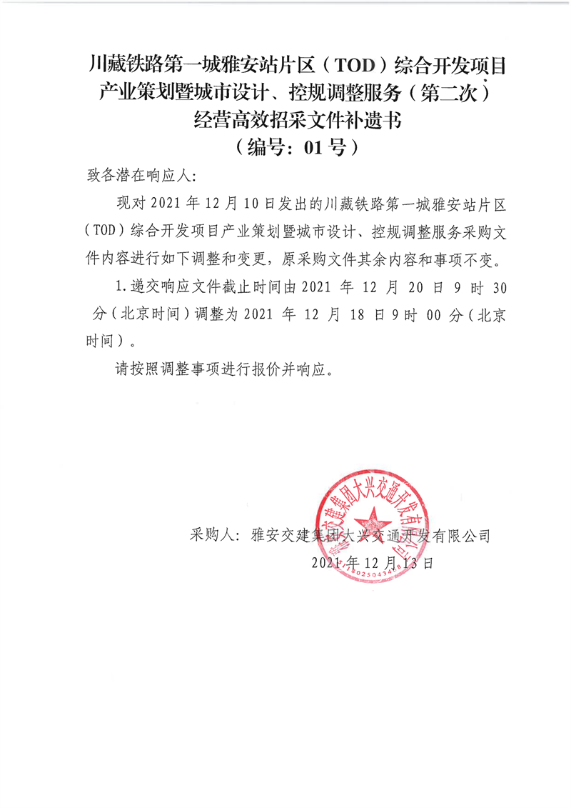 雅安交建集團大興交通開發(fā)有限公司川藏鐵路第一城雅安站片區(qū)(TOD)綜合開發(fā)項目產(chǎn)業(yè)策劃暨城市設計、控規(guī)調(diào)整服務(第二次)經(jīng)營高效招采文件補遺書(編號:01號)