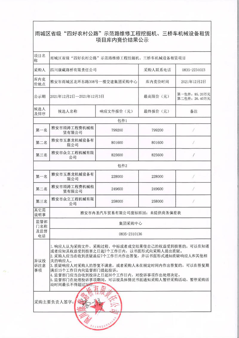 四川康藏路橋有限責(zé)任公司雨城區(qū)省級(jí)“四好農(nóng)村路”示范路維修工程挖掘機(jī)、三橋車機(jī)械設(shè)備租賃項(xiàng)目庫內(nèi)競價(jià)結(jié)果公示