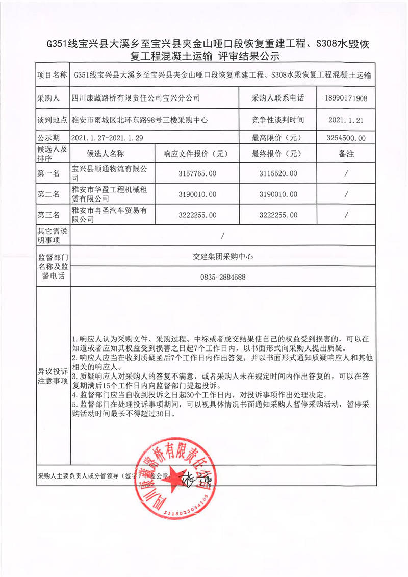 四川康藏路橋有限責任公司寶興分公司G351線寶興縣大溪鄉(xiāng)至寶興縣夾金山啞口段恢復(fù)重建工程、S308水毀恢復(fù)工程混凝土運輸評審結(jié)果公示