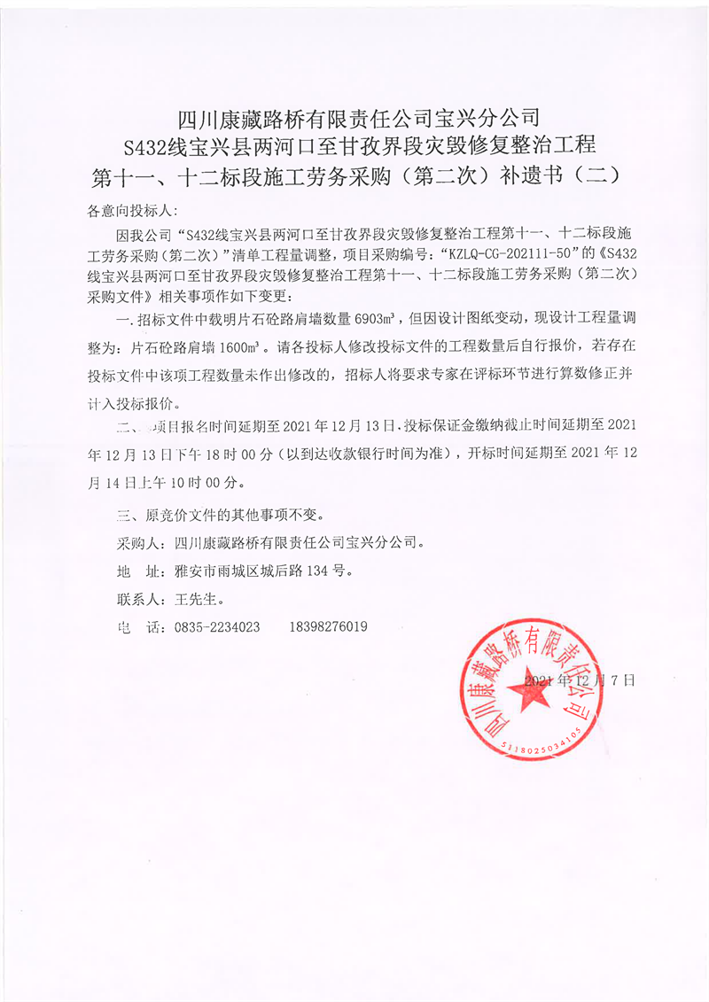 四川康藏路橋有限責(zé)任公司寶興分公司S432線寶興縣兩河口至甘孜界段災(zāi)毀修復(fù)整治工程第十一、十二標(biāo)段施工勞務(wù)采購(第二次)補(bǔ)遺書(二)