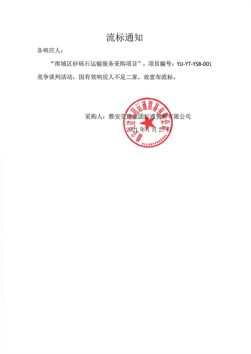 雅安交建集團運通貿(mào)易有限公司雨城區(qū)砂礫石運輸服務(wù)采購項目流標(biāo)通知