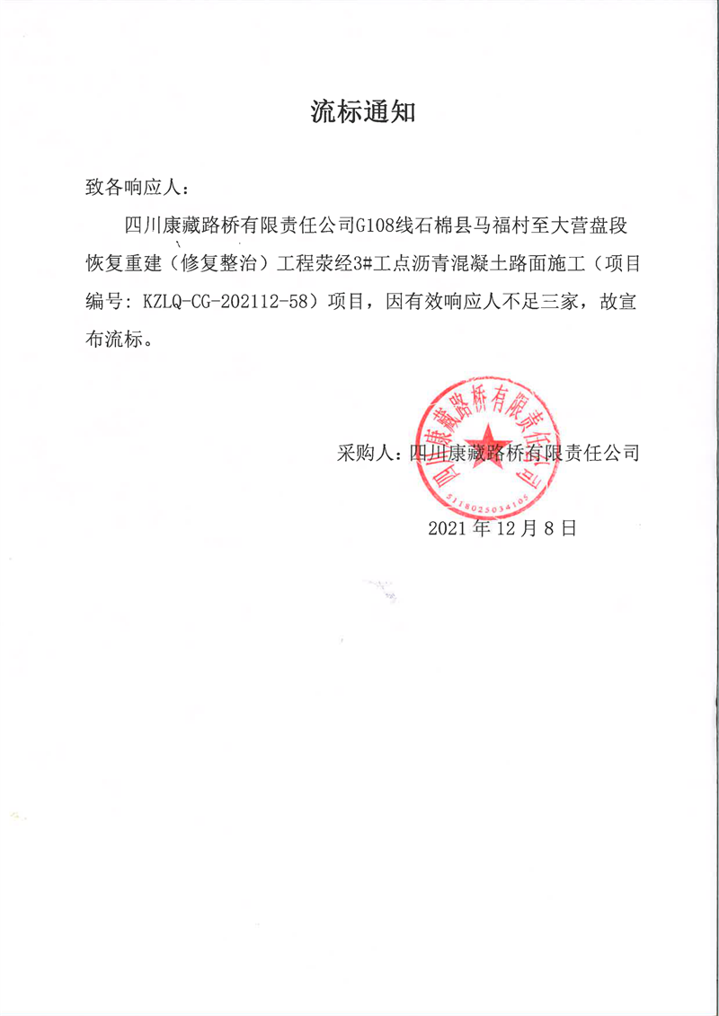 四川康藏路橋有限責(zé)任公司G108線石棉縣馬福村至大營(yíng)盤(pán)段恢復(fù)重建(修復(fù)整治)工程滎經(jīng)3#工點(diǎn)瀝青混凝土路面施工流標(biāo)通知