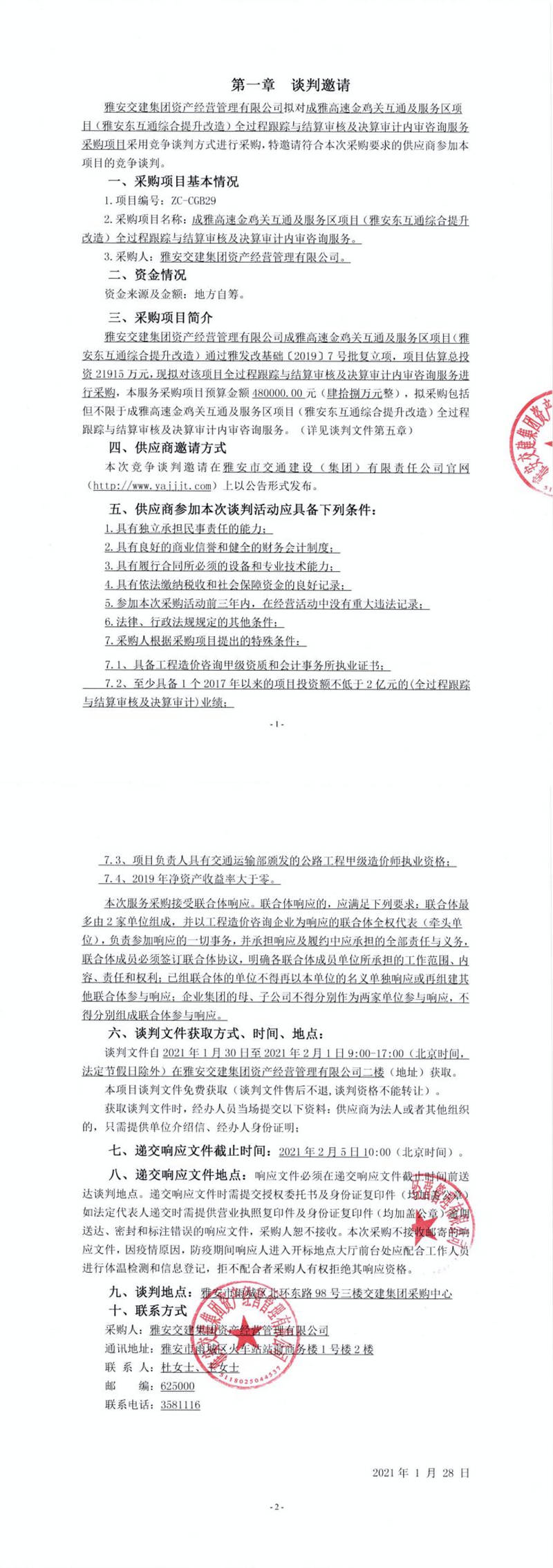 雅安交建集團(tuán)資產(chǎn)經(jīng)營(yíng)管理有限公司成雅高速金雞關(guān)互通及服務(wù)區(qū)項(xiàng)目(雅安東互通綜合提升改造)全過(guò)程跟蹤與結(jié)算審核及決算審計(jì)內(nèi)審咨詢服務(wù)談判公告