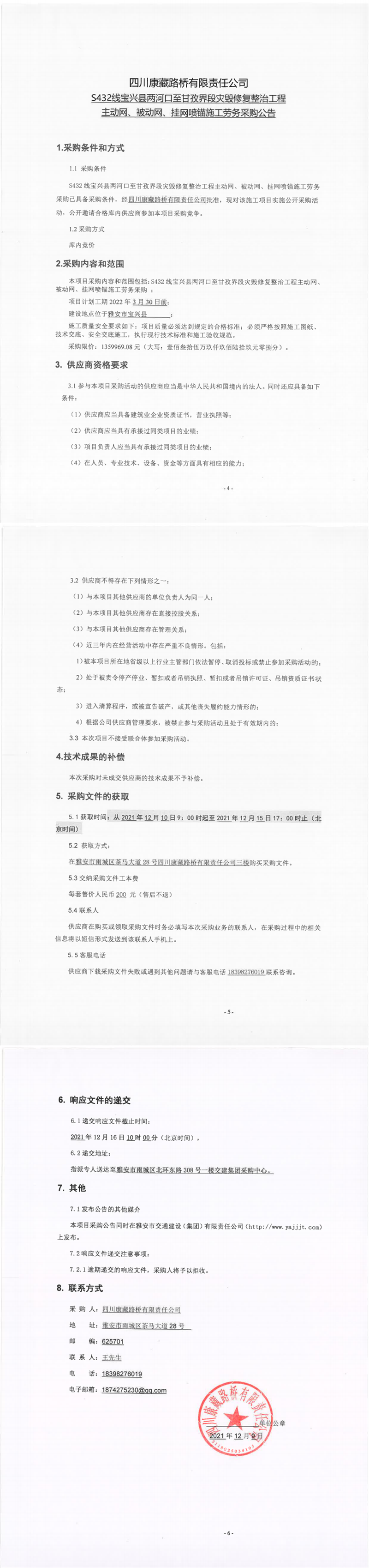 四川康藏路橋有限責(zé)任公司S432線(xiàn)寶興縣兩河口至甘孜界段災(zāi)毀修復(fù)整治工程主動(dòng)網(wǎng)、被動(dòng)網(wǎng)、掛網(wǎng)噴錨施工勞務(wù)采購(gòu)公告
