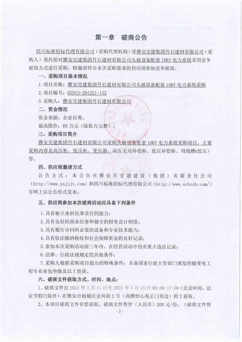 雅安交建集團(tuán)丹石建材有限公司頭破設(shè)備配套10KV電力系統(tǒng)競爭磋商公告