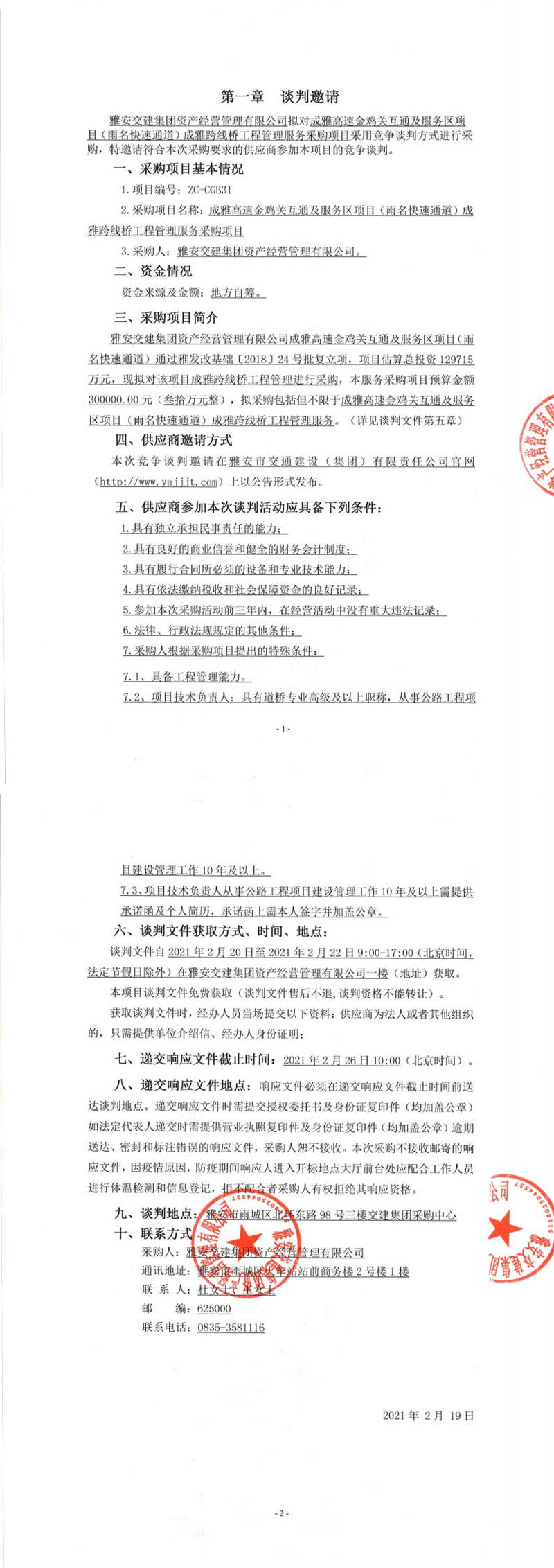 雅安交建集團(tuán)資產(chǎn)經(jīng)營管理有限公司成雅高速金雞關(guān)互通及服務(wù)區(qū)項目(雨名快速通道)成雅跨線橋工程管理服務(wù)采購項目競爭談判公告