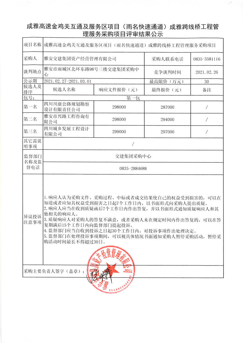 雅安交建集團(tuán)資產(chǎn)經(jīng)營管理有限公司成雅高速金雞關(guān)互通及服務(wù)區(qū)項(xiàng)目(雨名快速通道)成雅跨線橋工程管理服務(wù)采購項(xiàng)目評審結(jié)果公示