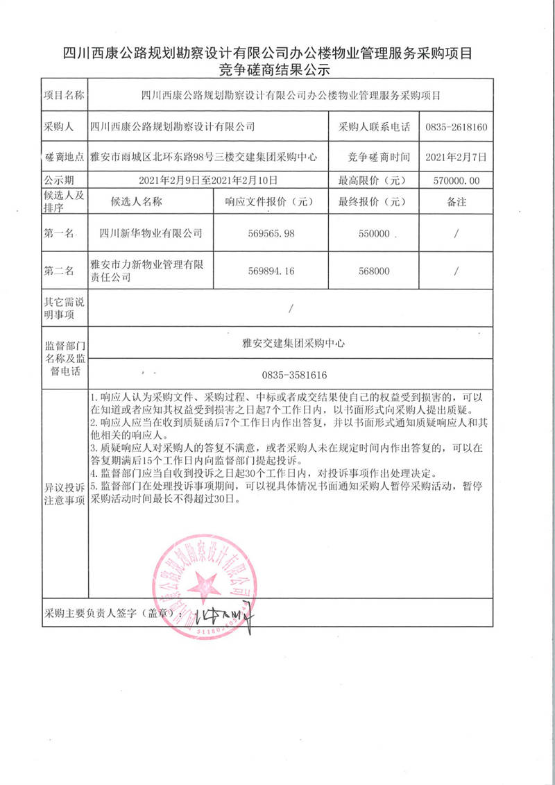 四川西康公路規(guī)劃勘察設(shè)計有限公司辦公樓物業(yè)管理服務(wù)采購項(xiàng)目競爭磋商結(jié)果公示