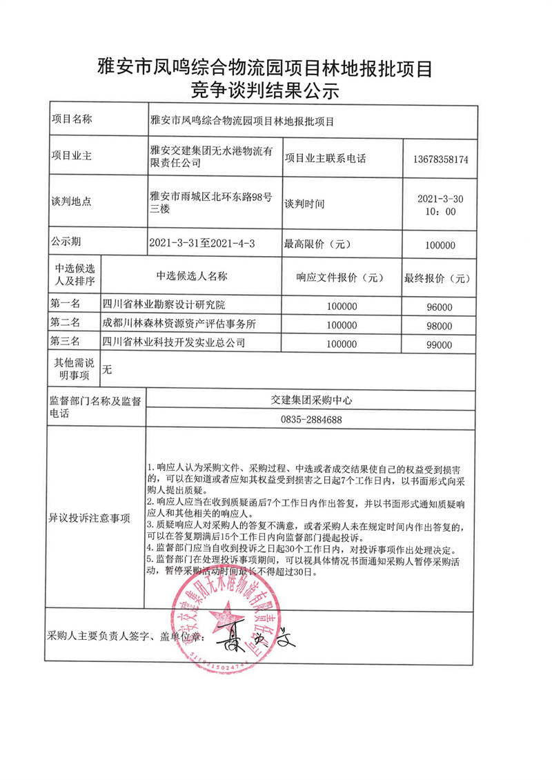 雅安交建集團(tuán)無(wú)水港物流有限責(zé)任公司雅安市鳳鳴綜合物流園項(xiàng)目林地報(bào)批項(xiàng)目競(jìng)爭(zhēng)談判結(jié)果公示