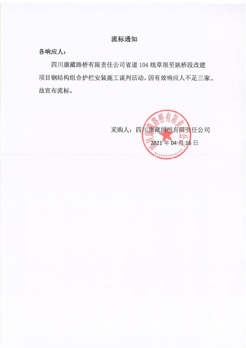 四川康藏路橋有限責(zé)任公司省道104線草壩至姚橋段改建項目鋼結(jié)構(gòu)組合護(hù)欄安裝施工流標(biāo)通知