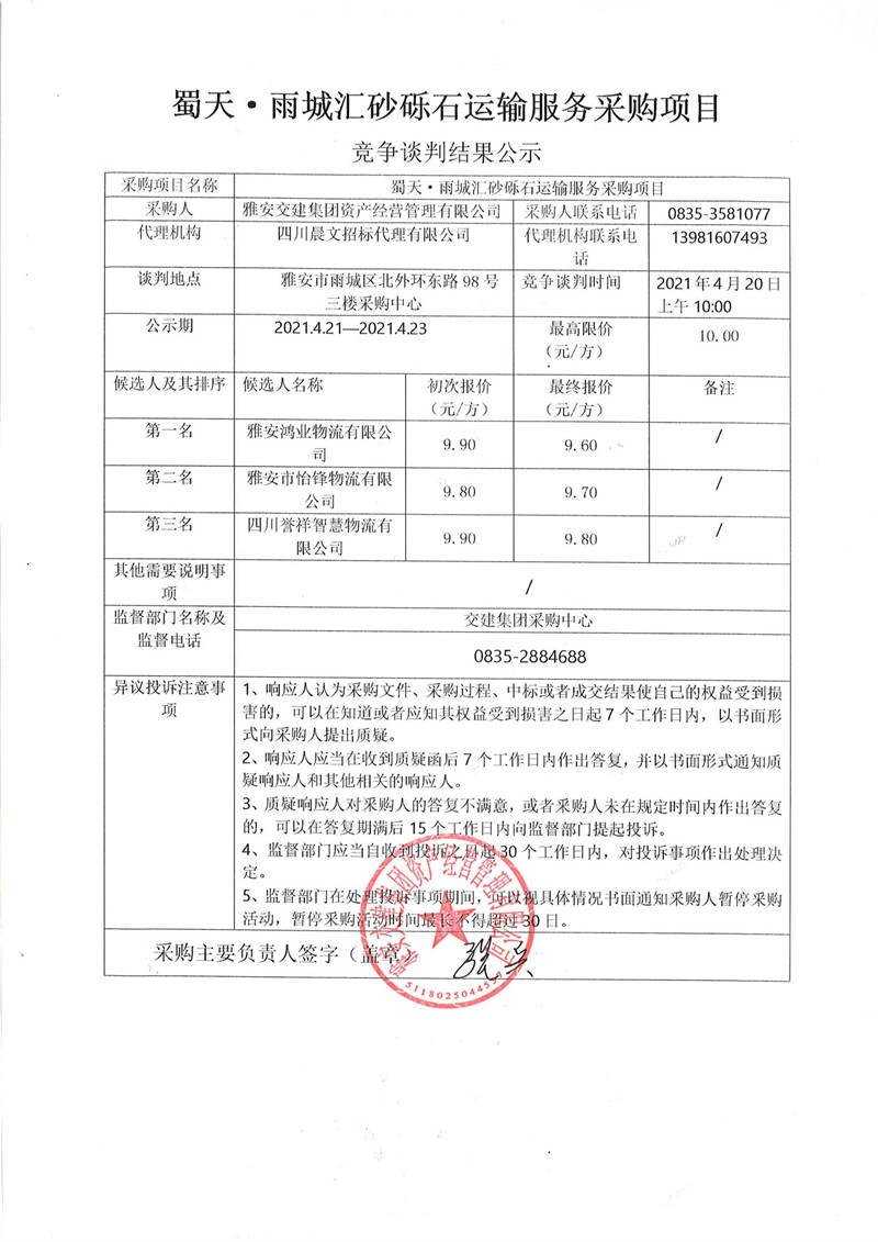 雅安交建集團資產(chǎn)經(jīng)營管理有限公司蜀天.雨城匯砂礫石運輸服務采購項目競爭談判結(jié)果公示