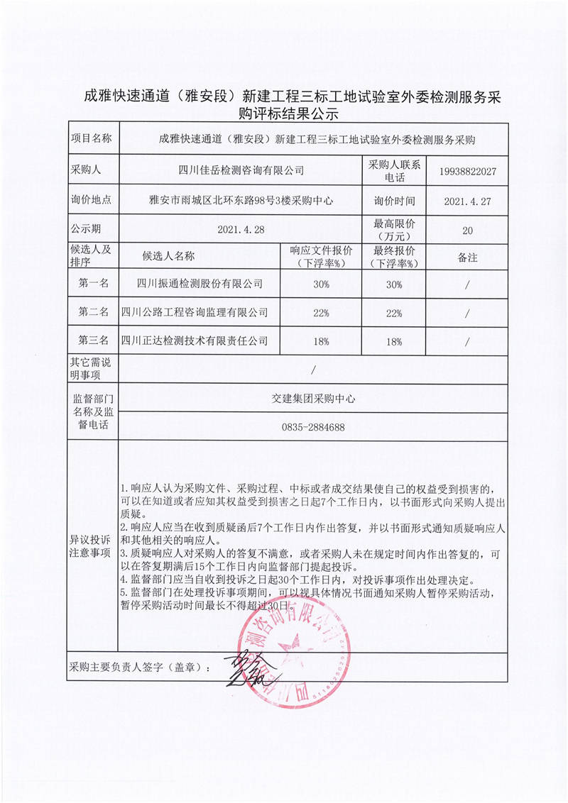四川佳岳檢測咨詢有限公司成雅快速通道(雅安段)新建工程三標工地試驗室外委檢測服務采購評標結(jié)果公示