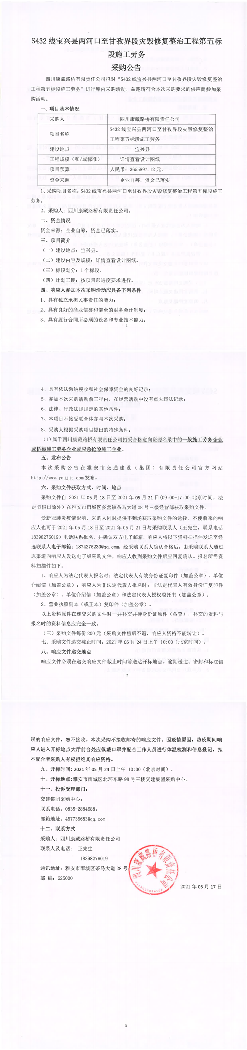 四川康藏路橋有限責(zé)任公司S432線寶興縣兩河口至甘孜界段災(zāi)毀修復(fù)整治工程第五標段施工勞務(wù)采購公告