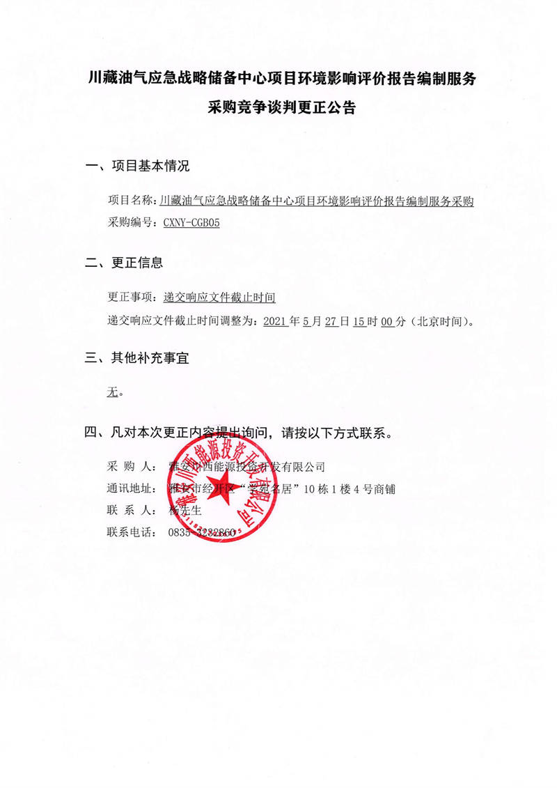 雅安川西能源投資開發(fā)有限公司川藏油氣應(yīng)急戰(zhàn)略儲備中心項(xiàng)目環(huán)境影響評價(jià)報(bào)告編制服務(wù)采購競爭談判更正公告