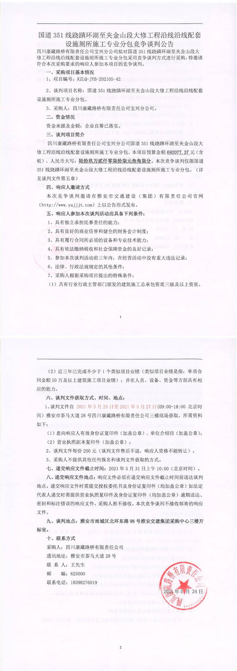 四川康藏路橋有限責任公司寶興分公司國道351線蹺磧環(huán)湖至夾金山段大修工程沿線沿線配套設施廁所施工專業(yè)分包競爭談判公告