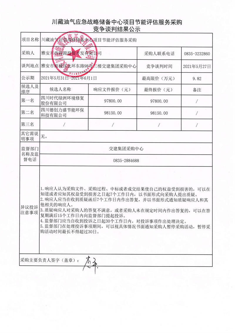 雅安川西能源投資開發(fā)有限公司川藏油氣應(yīng)急戰(zhàn)略儲備中心項(xiàng)目節(jié)能評估服務(wù)采購競爭談判結(jié)果公示