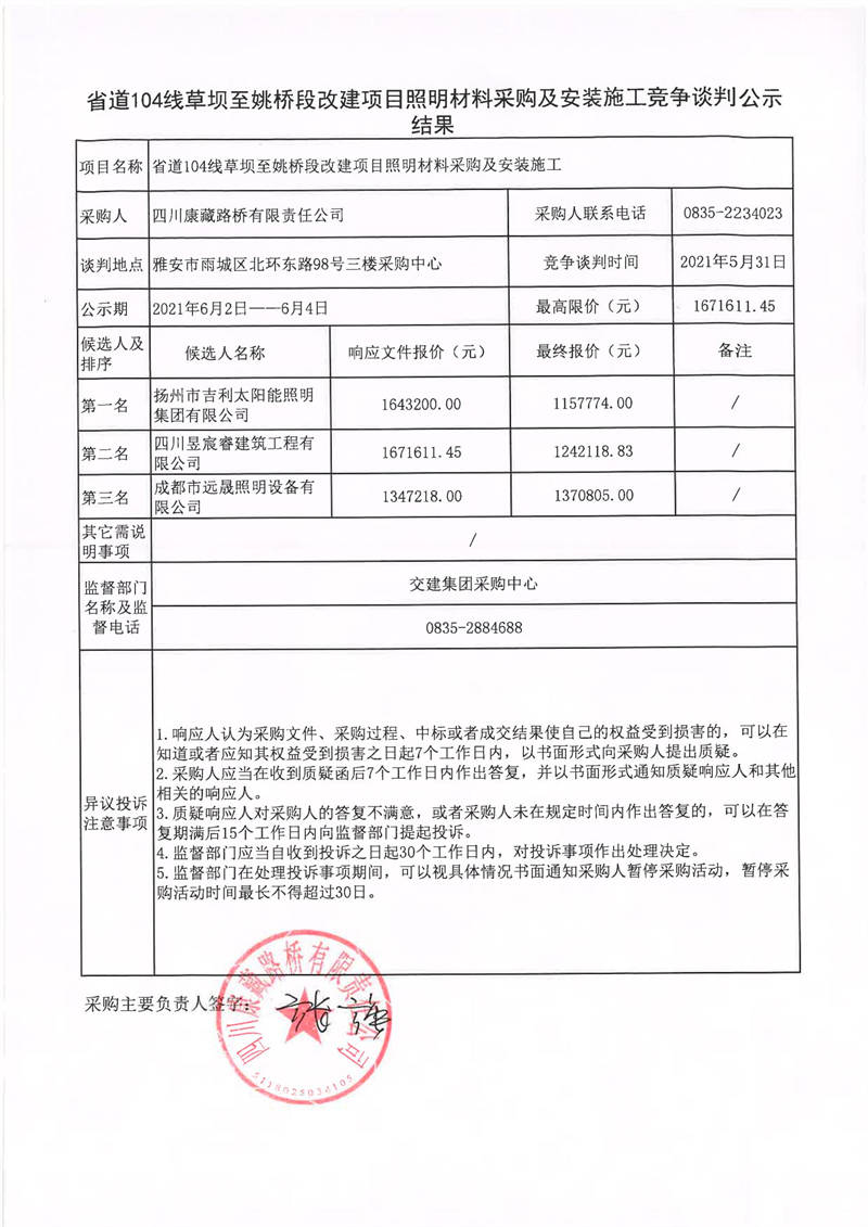 四川康藏路橋有限責(zé)任公司省道104線草壩至姚橋段改建項目照明材料采購及安裝施工競爭談判公示結(jié)果