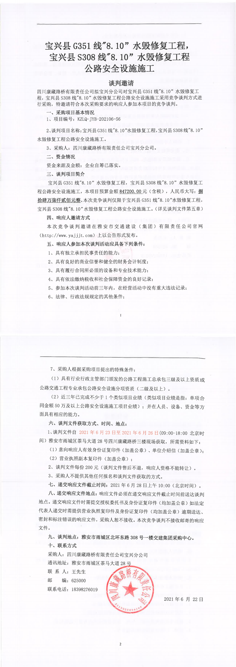 寶興縣G351線“8.10”水毀修復(fù)工程,寶興縣S308線“8.10”水毀修復(fù)工程公路安全設(shè)施施工競爭談判公告