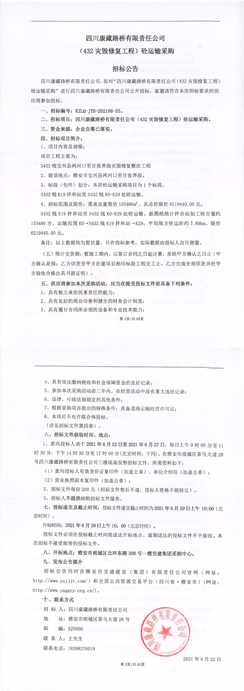 四川康藏路橋有限責(zé)任公司(432災(zāi)毀修復(fù)工程)砼運(yùn)輸采購(gòu)招標(biāo)公告