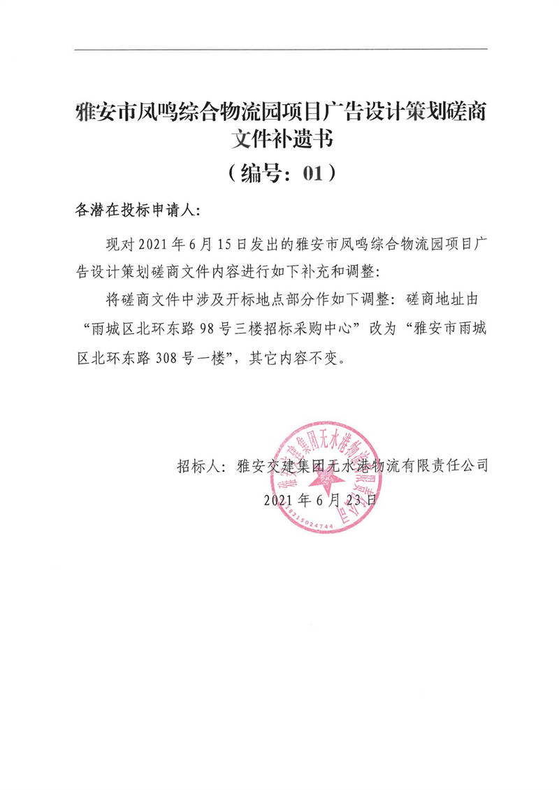雅安交建集團(tuán)無水港物流有限責(zé)任公司雅安市鳳鳴綜合物流園項目廣告設(shè)計策劃磋商文件補(bǔ)遺書