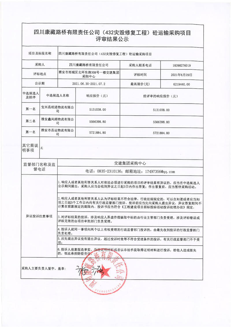 四川康藏路橋有限責(zé)任公司S432線寶興縣兩河口至甘孜界段災(zāi)毀修復(fù)整治工程砼運(yùn)輸采購(gòu)項(xiàng)目評(píng)審結(jié)果公示