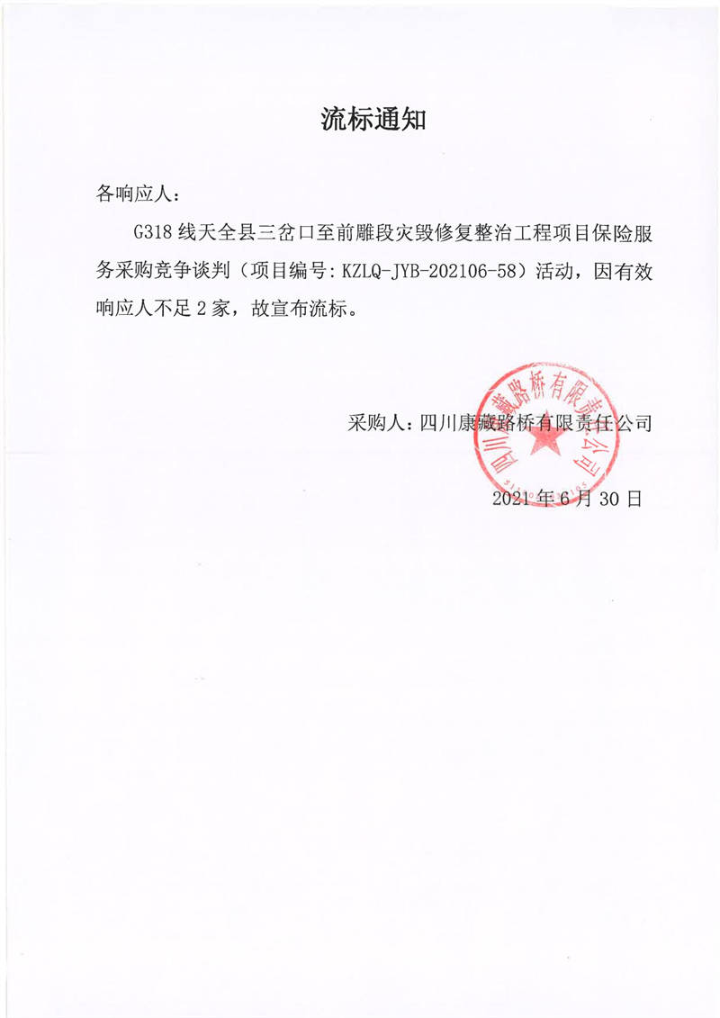 四川康藏路橋有限責(zé)任公司G318線(xiàn)天全縣三岔口至前雕段災(zāi)毀修復(fù)整治工程項(xiàng)目保險(xiǎn)服務(wù)采購(gòu)流標(biāo)通知