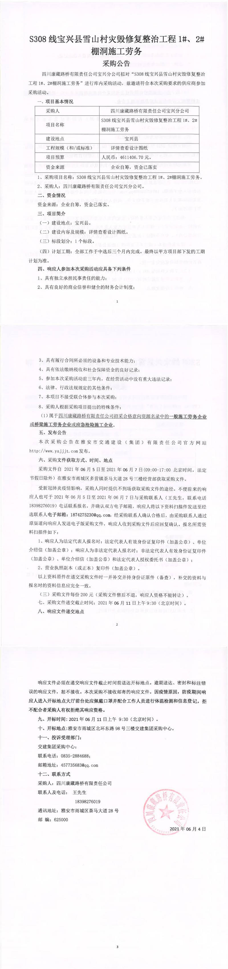 四川康藏路橋有限責任公司S308線寶興縣雪山村災毀修復整治工程1#、2#棚洞施工勞務(wù)采購公告