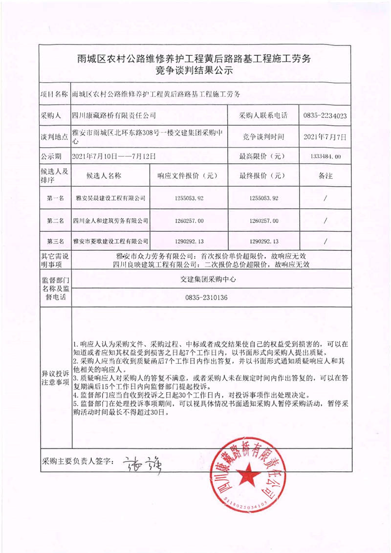 四川康藏路橋有限責任公司雨城區(qū)農(nóng)村公路維修養(yǎng)護工程黃后路路基工程施工勞務(wù)競爭談判結(jié)果公示