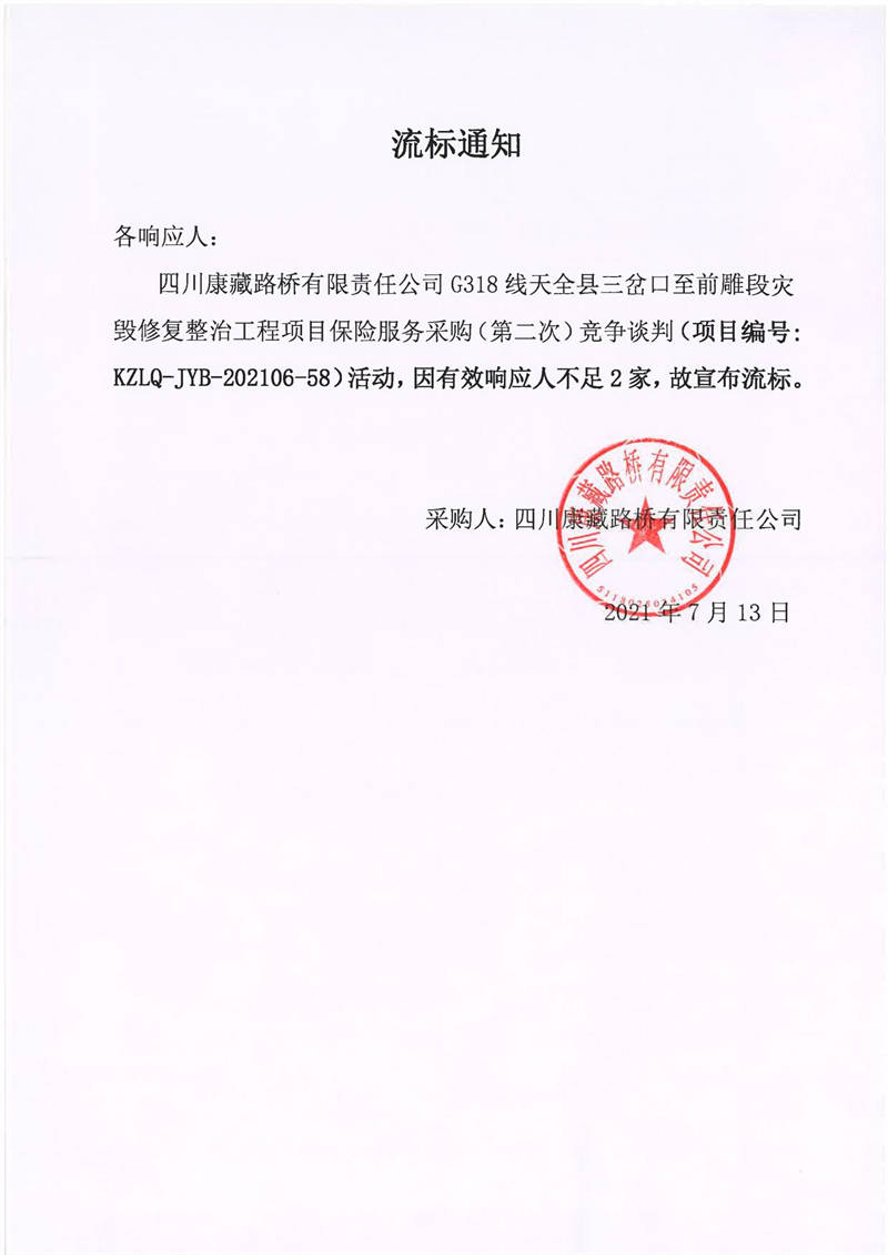 四川康藏路橋有限責(zé)任公司G318線天全縣三岔口至前雕段災(zāi)毀修復(fù)整治工程項目保險服務(wù)采購(第二次)流標通知