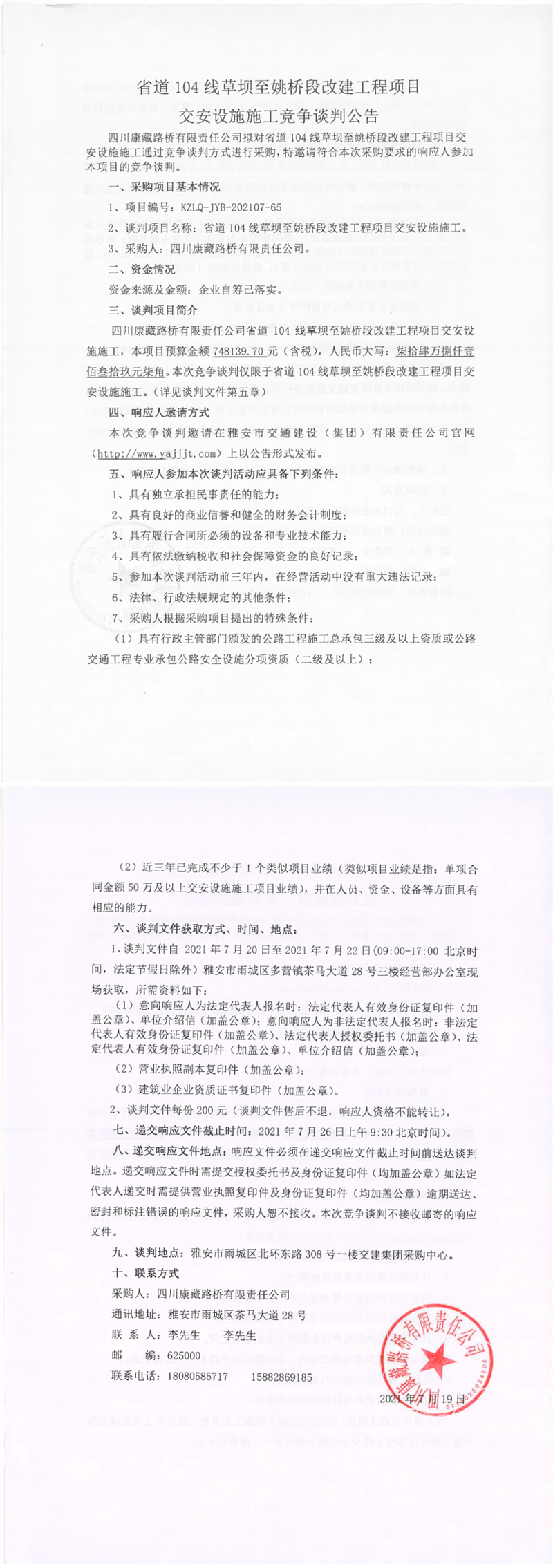 四川康藏路橋有限責(zé)任公司省道104線草壩至姚橋段改建項(xiàng)目交安設(shè)施施工競(jìng)爭(zhēng)談判公告