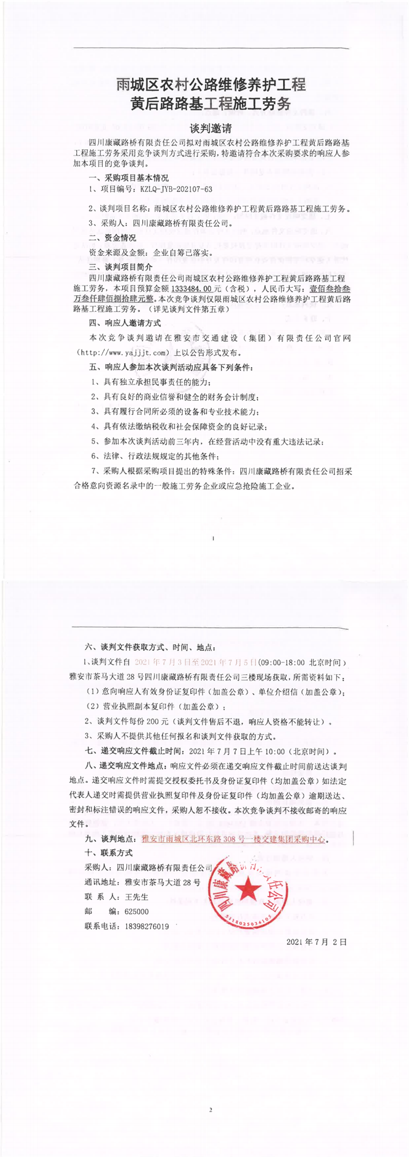 四川康藏路橋有限責任公司雨城區(qū)農(nóng)村維修養(yǎng)護工程黃后路路基工程施工勞務(wù)競爭談判公告
