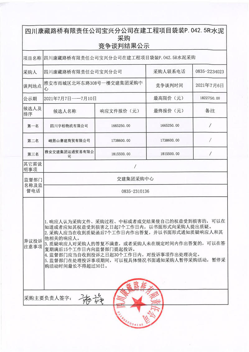 四川康藏路橋有限責(zé)任公司寶興分公司在建工程項(xiàng)目袋裝P.042.5R水泥采購(gòu)競(jìng)爭(zhēng)談判結(jié)果公示