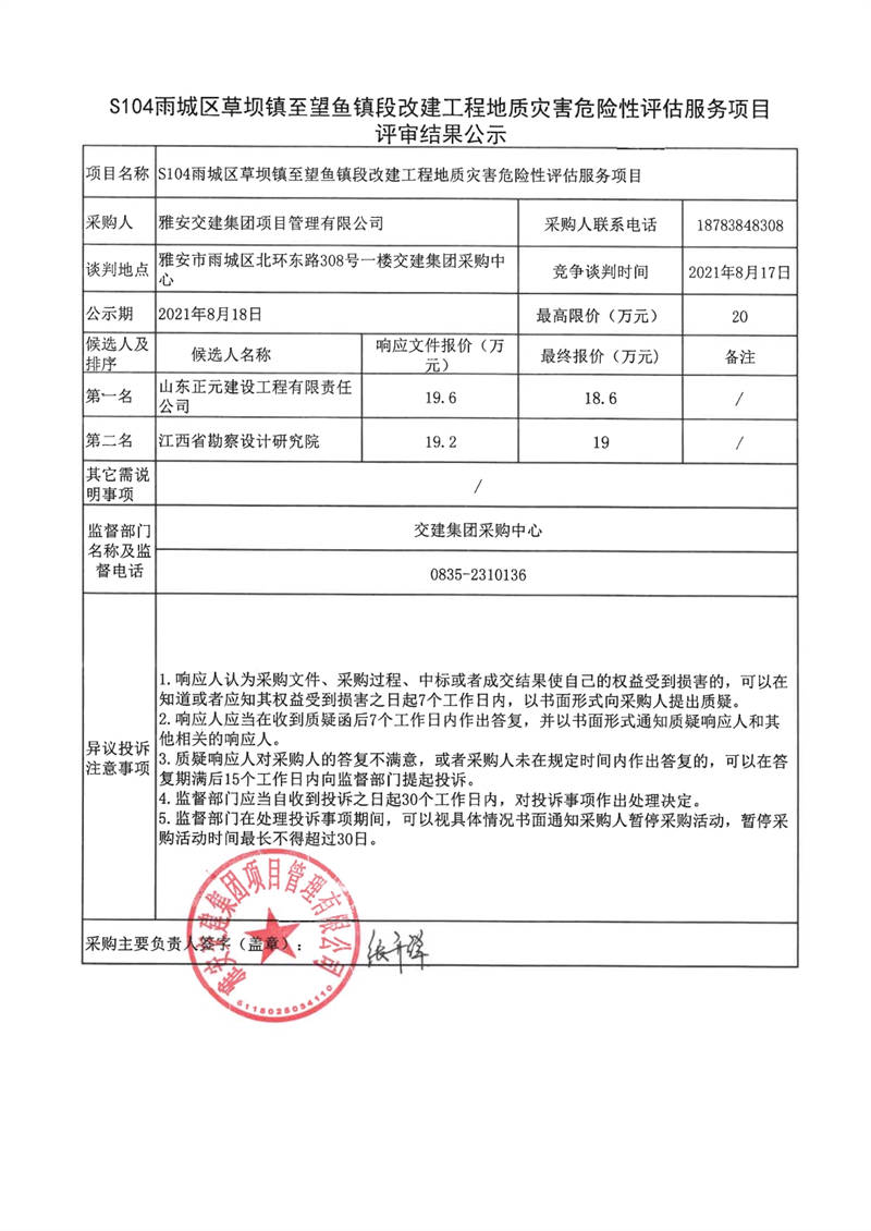 雅安交建集團(tuán)項目管理有限公司S104雨城區(qū)草壩鎮(zhèn)至望魚鎮(zhèn)改建工程地質(zhì)災(zāi)害危險性評估服務(wù)項目評審結(jié)果公示