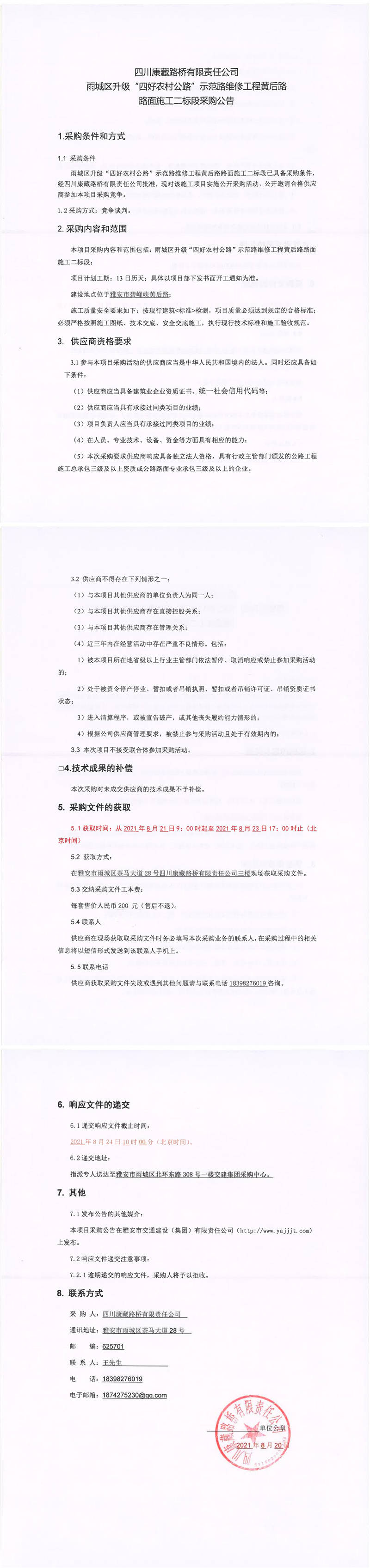 四川康藏路橋有限責任公司雨城區(qū)升級“四好農村公路”示范路維修工程黃后路路面施工二標段采購公告