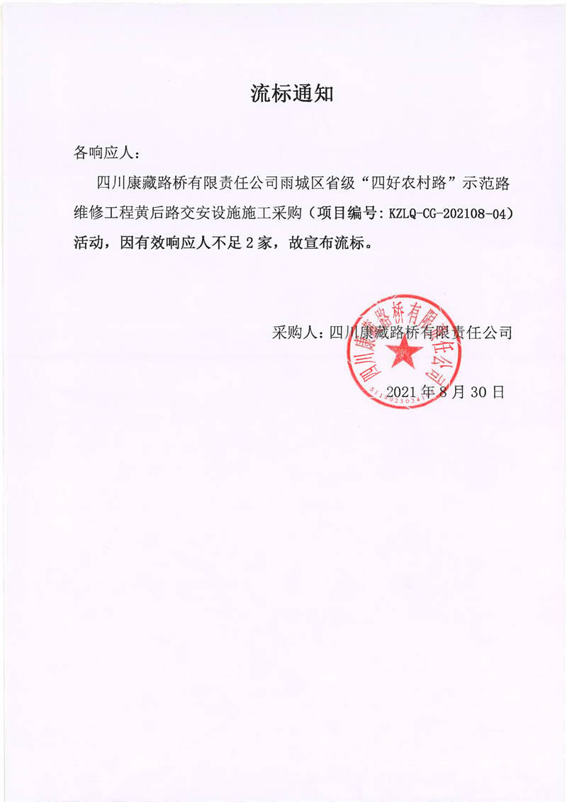 四川康藏路橋有限責任公司雨城區(qū)省級“四好農村路”示范路維修工程黃后路交安設施施工采購流標通知
