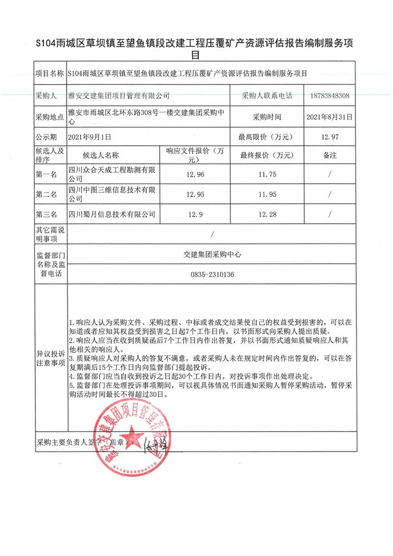 雅安交建集團項目管理有限公司S104雨城區(qū)草壩鎮(zhèn)至望魚鎮(zhèn)段改建工程壓覆礦產資源評估報告編制服務項目評審結果公示